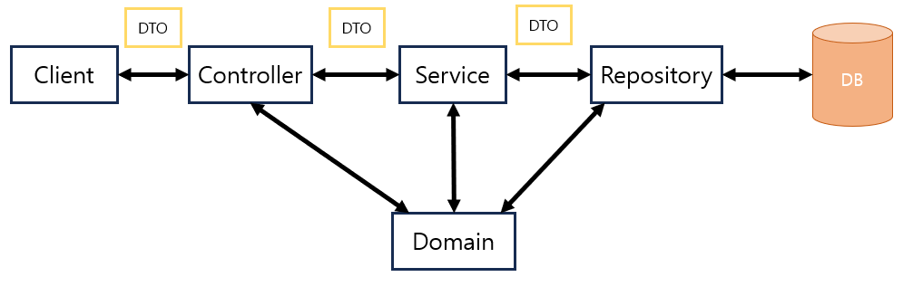 1. 기본적인 스프링의 구조 앞에서 Controller와 Service, Repository, Domain 에 대해 정리했었다. 이제 위 그림을 보면 사이사이 DTO라는 단어가 보인다. DTO는 위 그림과 같이 구조 사이 사이 데이터를 전달할 때 사용하며 계층을 나누어 관리한다. 2. DTO 란? DTO(Data Transfer Object) 단어 그대로 데이터 전달 객체라는 뜻이며, 데이터를 전달하기 위한 객체이다. 보통 DTO는 두가지로 나뉜다. Client가 요청을 보낼 때 사용하는 RequestDto, 다시 Client에게 응답을 해주는 ResponseDto이다. DTO는 오직 데이터를 전달하기 위한 객체로 getter와 setter만을 가진다. 하지만 setter는 데이터의 변경을 위해 존재하기..